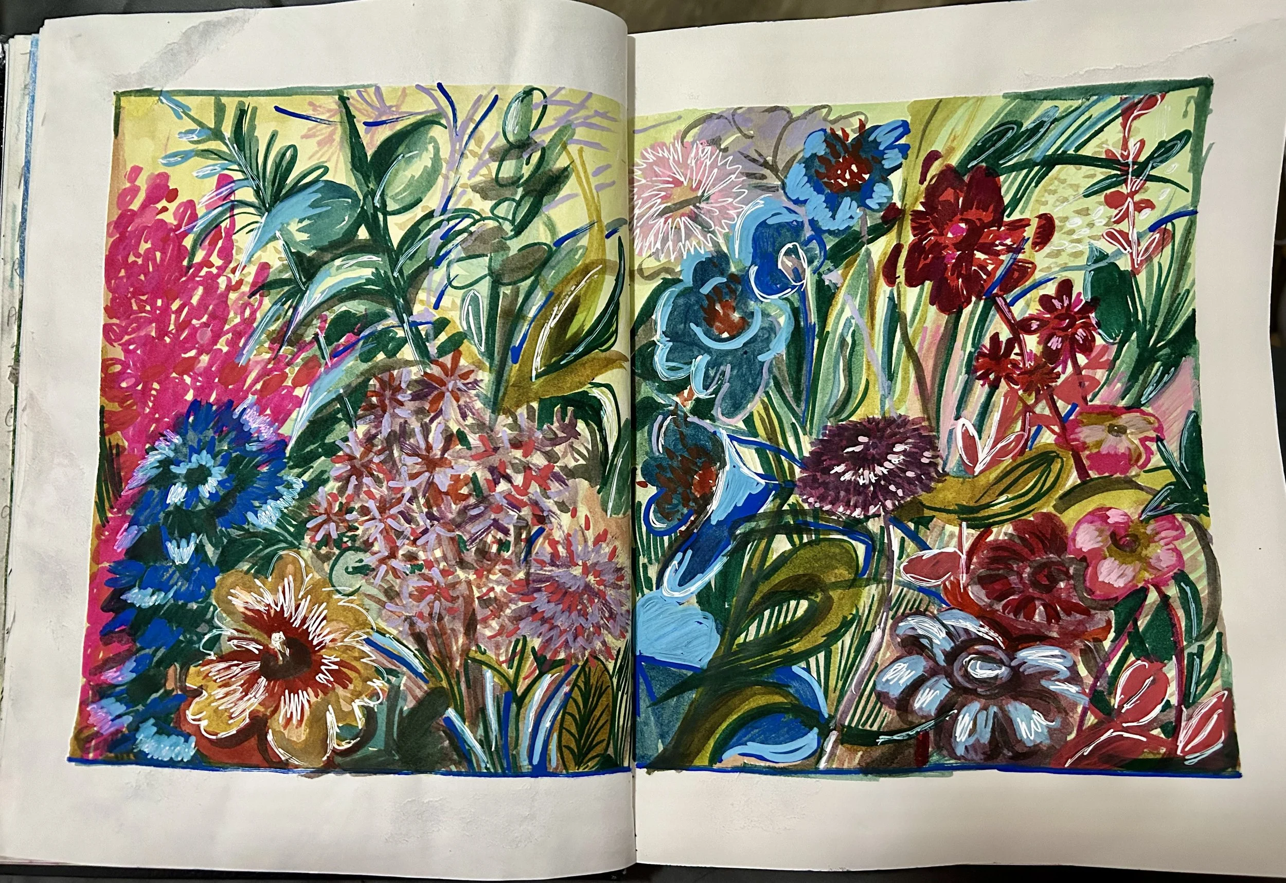“Flowers” (2024). Watercolor, marker, colored pencil, and pen on paper.